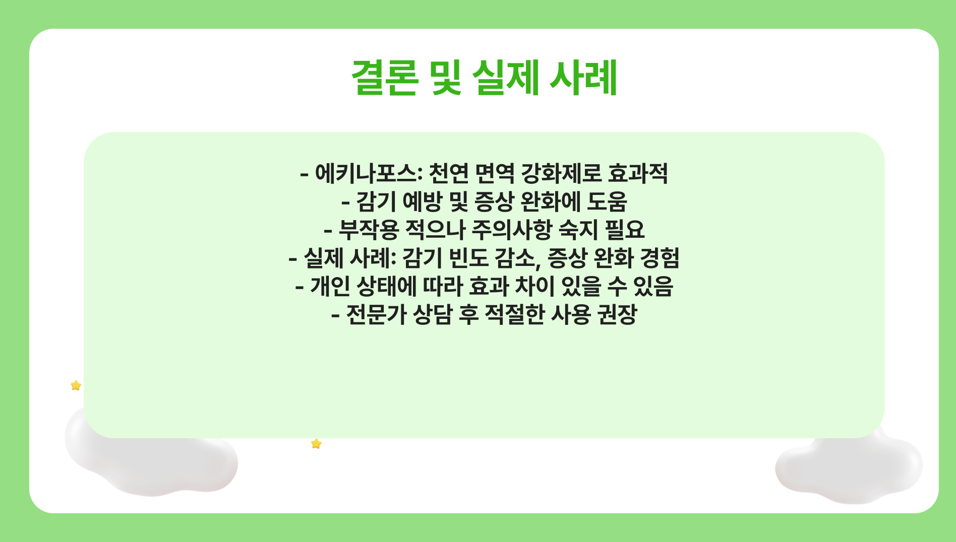 에키나포스는 감기와 면역력 강화에 효과적인 천연감기약으로, 올바른 복용법과 주의사항을 지키면 건강한 겨울을 보내는 데 큰 도움을 줄 수 있습니다. 개인의 상태와 필요에 맞게 선택하고, 의심스러운 점은 전문가와 상의하세요.