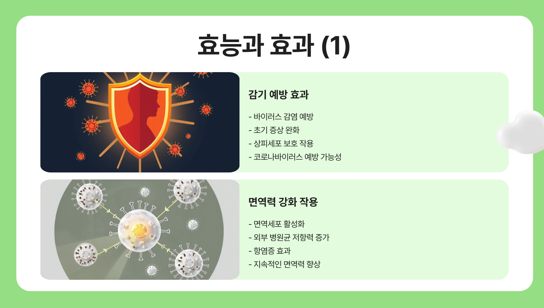 면역력 강화: 면역계를 활성화하여 외부 병원균에 대한 저항력을 높입니다.