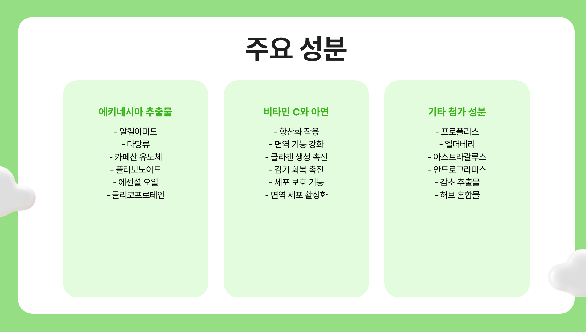 에키나포스의 주성분은 에키네시아 추출물로, 여기에 면역력 증진에 도움을 주는 비타민 C와 아연이 포함된 경우도 많습니다. 일부 제품에는 부가적으로 프로폴리스, 허브 혼합물이 첨가되어 시너지 효과를 제공합니다.