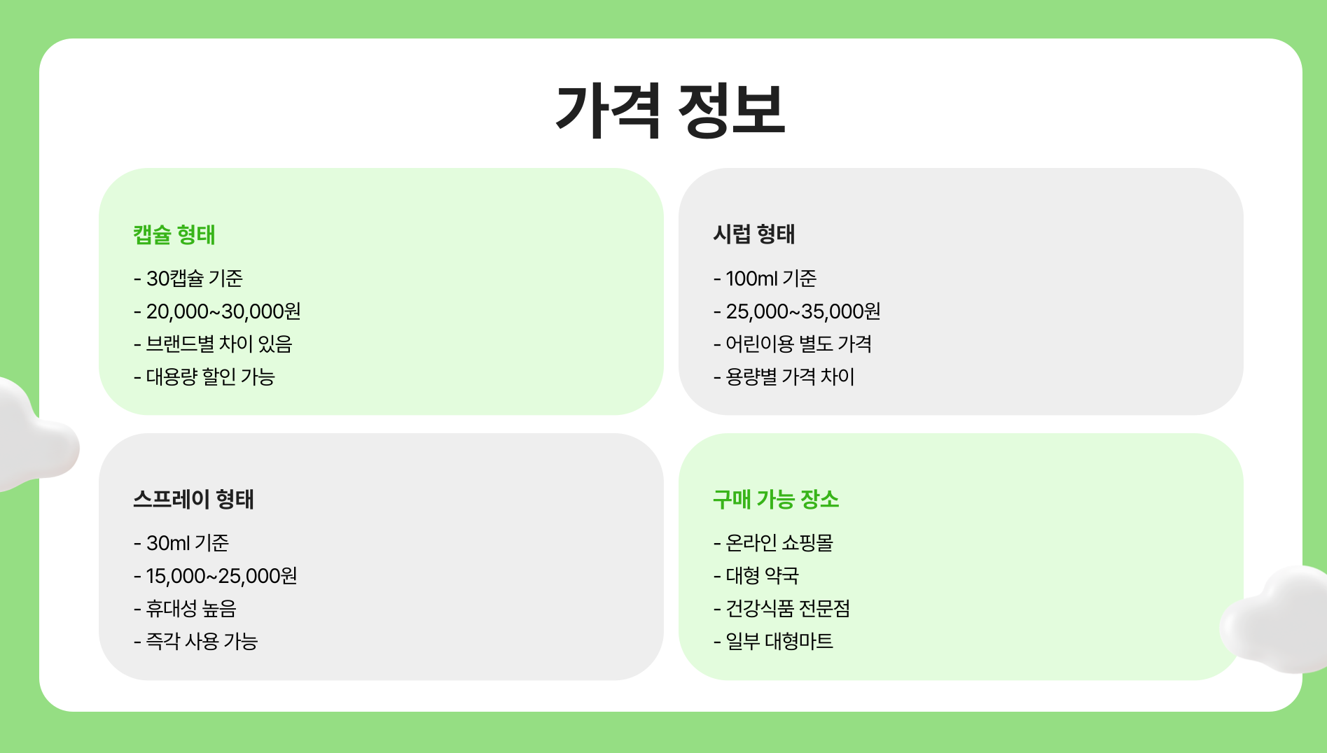 에키나포스의 가격은 제품 유형과 용량에 따라 다릅니다. 일반적으로 30 캡슐 기준으로 20,000원에서 40,000원 사이이며, 시럽 형태의 경우 약간 더 비싼 경향이 있습니다. 온라인 쇼핑몰과 약국에서 손쉽게 구매할 수 있습니다.